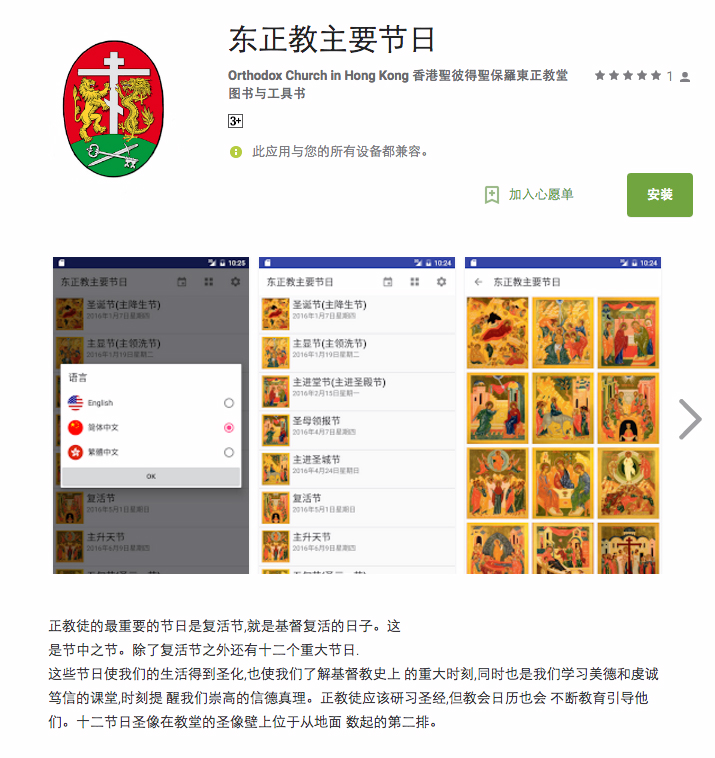 在该应用程式中包含了简短的节日说明及其圣像。应用程式可使用三种语言(英文、汉语正体字和简体字)。