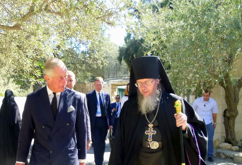 阿拉曼神父站在可以俯瞰耶路撒冷旧城的圣携香女玛利亚圣堂的庭院向查尔斯亲王展示了基督复活圣堂和圣城的其它圣地。客西马尼园女修道院的女掌院伊莉莎伯站在宏伟的皇家教堂门口欢迎亲王并按照俄国传统为其献上了面包和盐巴。