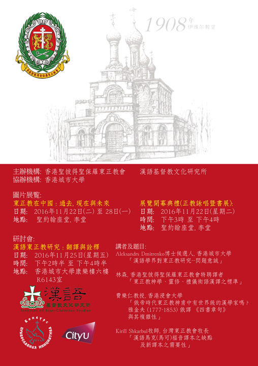 11月22日至28日,由香港圣彼得圣保罗教会及汉语基督教文化研究所主办,香港城市大学协办的「东正教在中国」展将于香港举行。展览开幕典礼(正教圣乐音乐会及书展)将于下午3时于圣约翰座堂之李堂举行,图片展将于22日至28日于同一地点举行。此外,本次展览之研讨会将于25日下午2时半于香港城市大学康乐楼六楼R6143室举行。诚邀各位莅临参与。