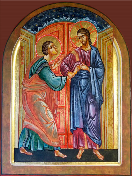 基督在复活后,向门徒显现。年轻的多马在基督首次显现时并不在场,及后便说只有亲自触摸圣伤才会相信基督复活(约翰福音20:19-31)。因此,教会传统中一直有不少信友称他为「多疑的多马」。上主体恤多马的疑窦,再次显现并要他触摸圣伤。我们趋前凝视这个圣像时,看到的并非「多疑的多马」,而是看见基督回应着他那信心不足的多马,并扶助他的门徒热切地、毫不含糊地宣告基督的神位。我们这圣像显示一个重拾信心的多马