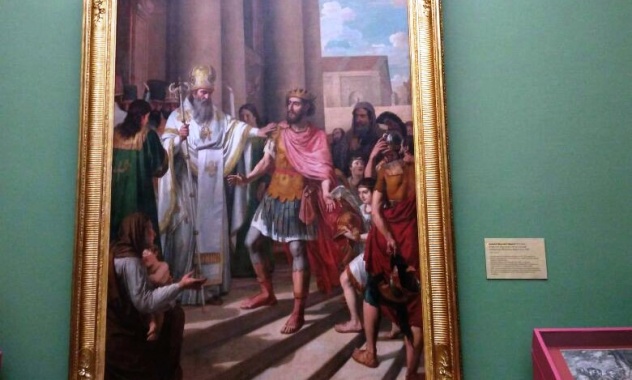 Проведенные в 2015–2017 годах реставрация и комплексные исследования позволили не только вернуть полотну первозданные живописные качества, но и выяснить подлинную иконографию сюжета картины, что повлекло за собой обнаружение интересных фактов истории ее создания и дальнейшей непростой судьбы. Художник запечатлел эпизод из жития святителя Амвросия Медиоланского, запретившего императору Феодосию войти в храм и причаститься после учиненной им кровавой расправы над восставшими фессалоникийцами. Научные изыскания в архивах позволили выяснить, что произведение на столь редкую для русского искусства тему было исполнено Андреем Ивановым в ряду других заказов для Сретенского храма Духовной миссии в Пекине.