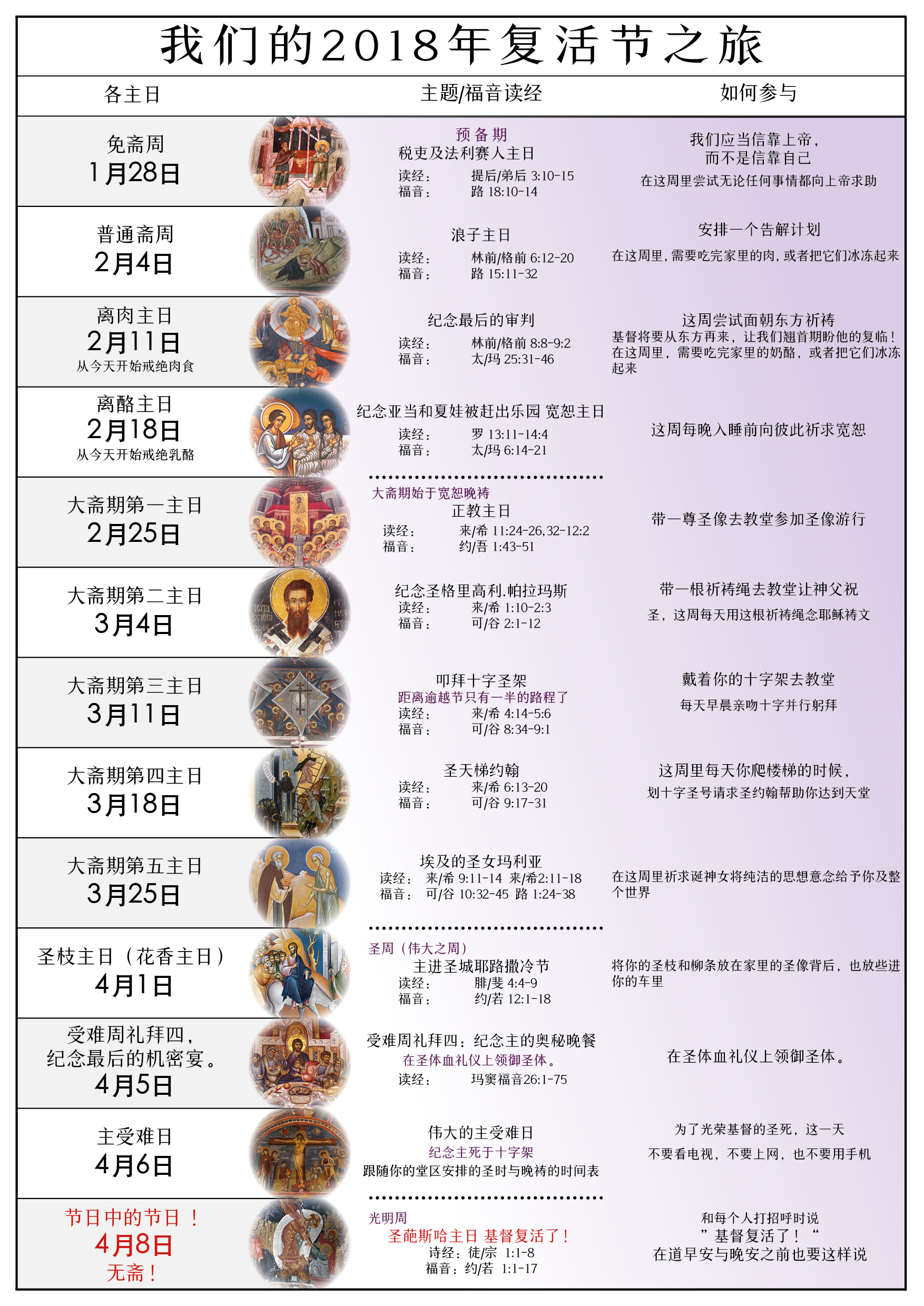 За основу для текста этого издания взят американский православный календарь о.Джонатана Беннона. Календарь рассказывает об основных событиях Постной Триоди и ее литургических чтениях. Календарь доступен для последующего использования и для распечатки в распространенных форматах по соответствующим ссылкам.