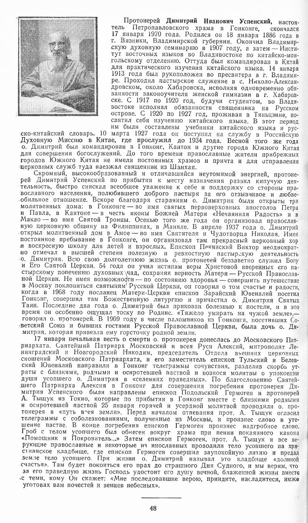 Связь с начальником миссии и правящим архиереем прервалась. Последний православный епископ в Пекине Виктор уехал в Москву. Протоиерей Успенский остался в духовной блокаде. Такое положение из-за издержек большой политики затянулось почти на 20 лет. Только в 1968-м епископ Зарайский Ювеналий (Поярков) – будущий митрополит Крутицкий, руководитель отдела внешних церковных сношений РПЦ, посетил Гонконг проездом из Токио. Владыка наградил протоиерея Димитрия наперсным крестом – наградой от патриарха Московского и всея Руси Алексия I за многолетние самоотверженные труды на благо православия. 28 ноября 1968-го владыка Ювеналий совершил в Петропавловском храме Гонконга Божественную Литургию – это было первое архиерейское служение в этом городе, начиная с 1945 года.